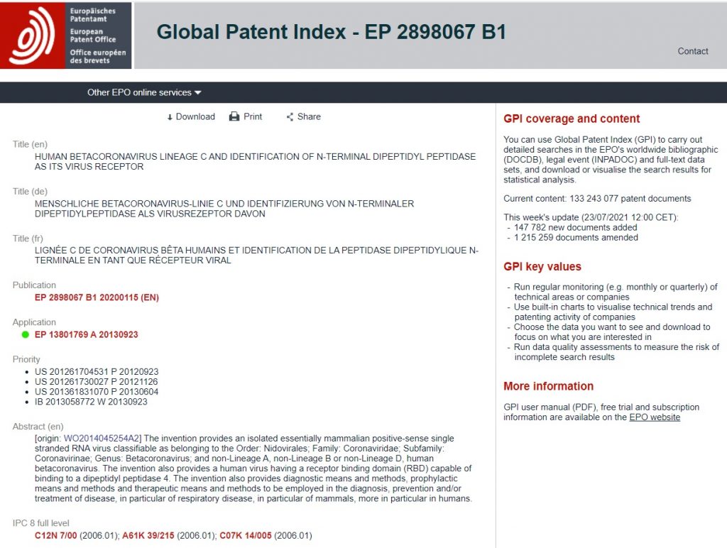 When the MERS virus was initially sent to the Erasmus Medical Center in the Netherlands, Erasmus submitted a patent application dated September 23, 2013 for the MERS virus to the European Patent Office. This gave them oversight as to the distribution of any and all genetic material and vaccines that could be developed from this MERS virus. 7